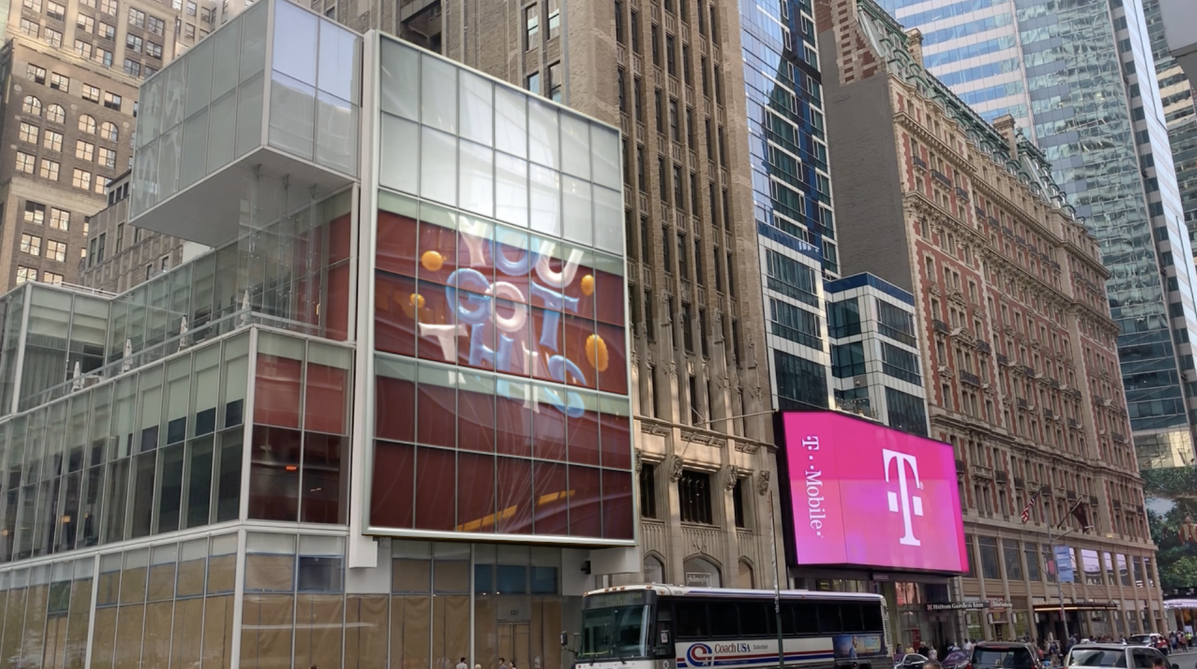In this piece, we get a glimpse of an alternate reality parade as it's reflected in the windows of the city. This site-specific video work replicates the facade of the building on which the LED display is mounted to give the effect that the building windows are rippling.